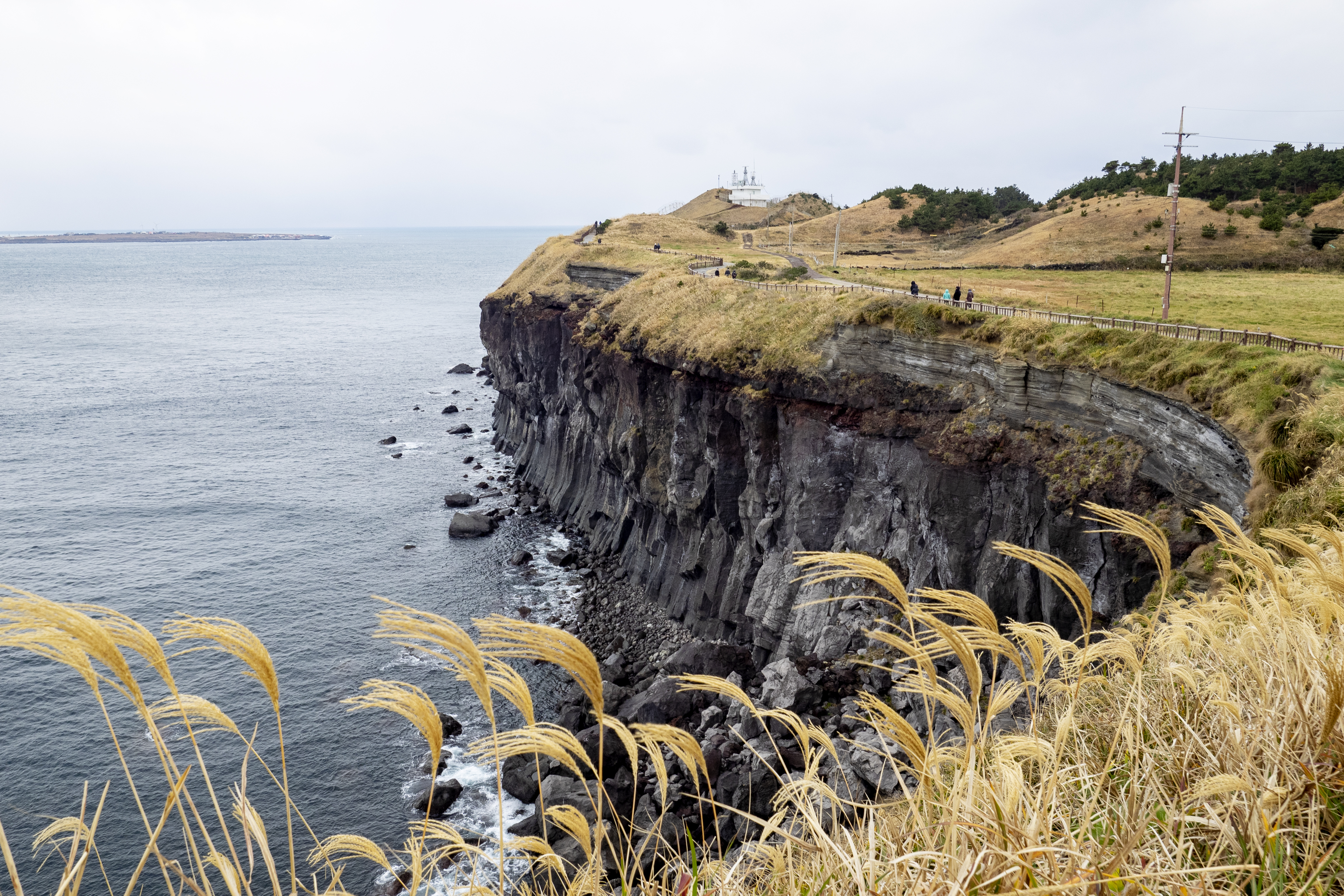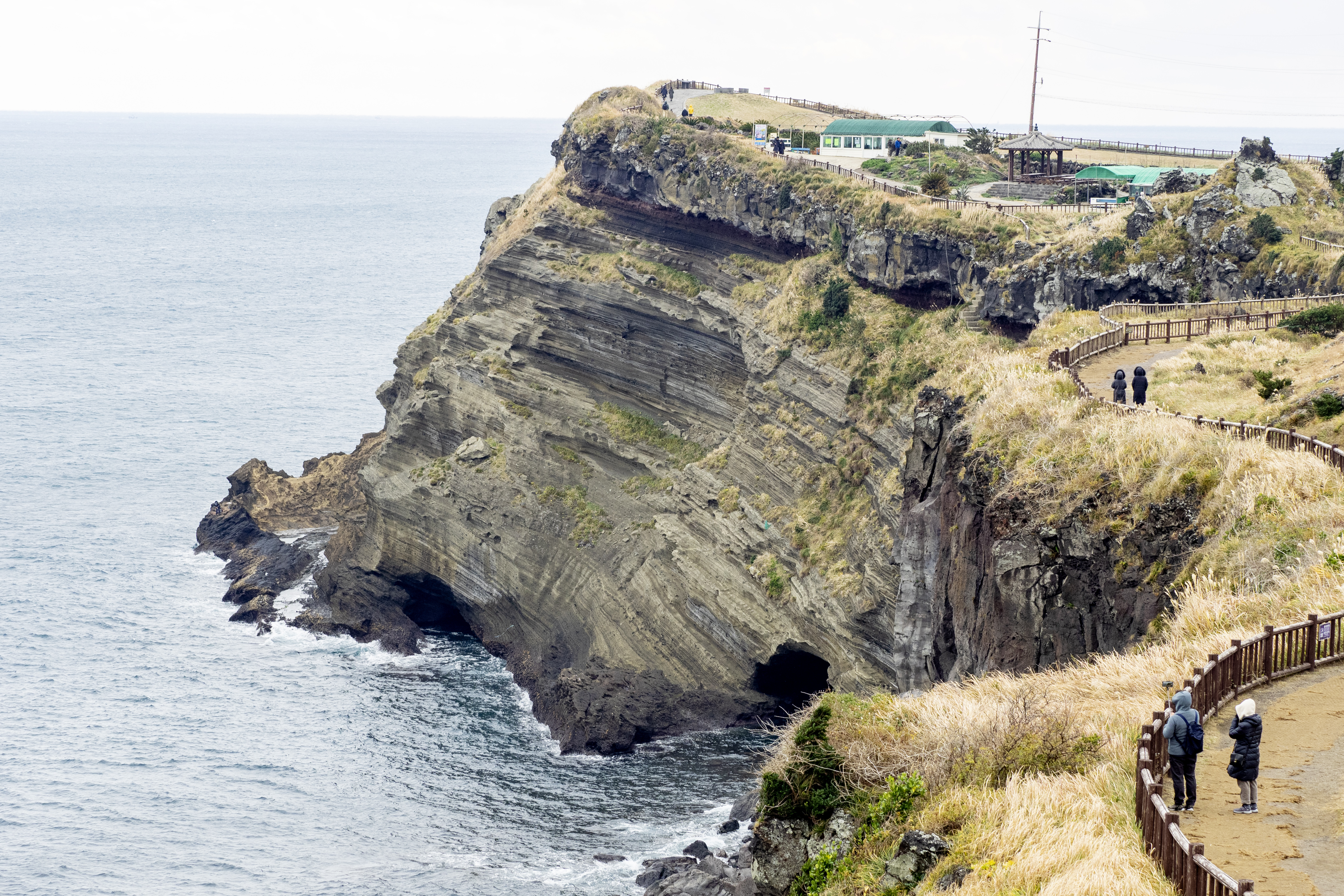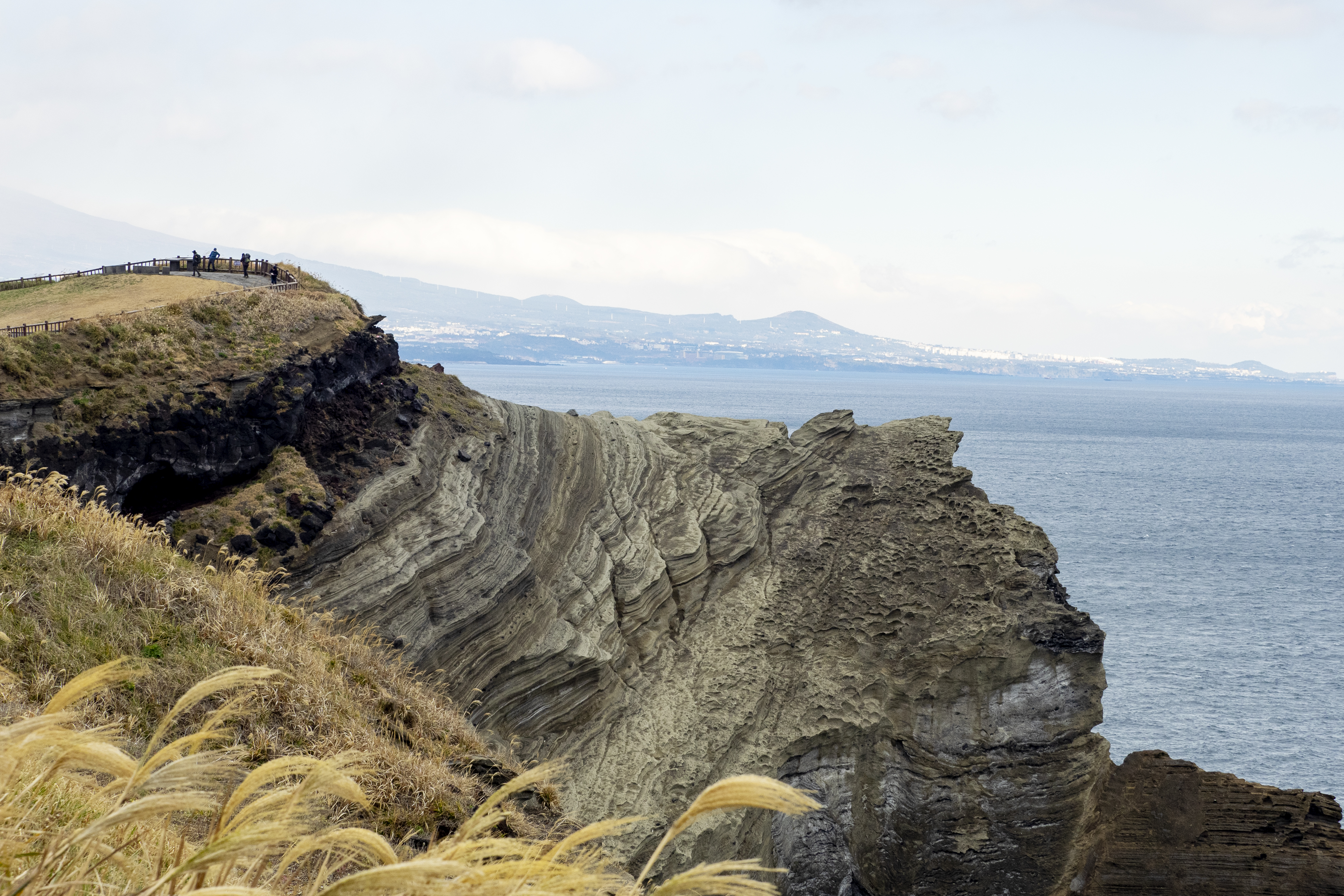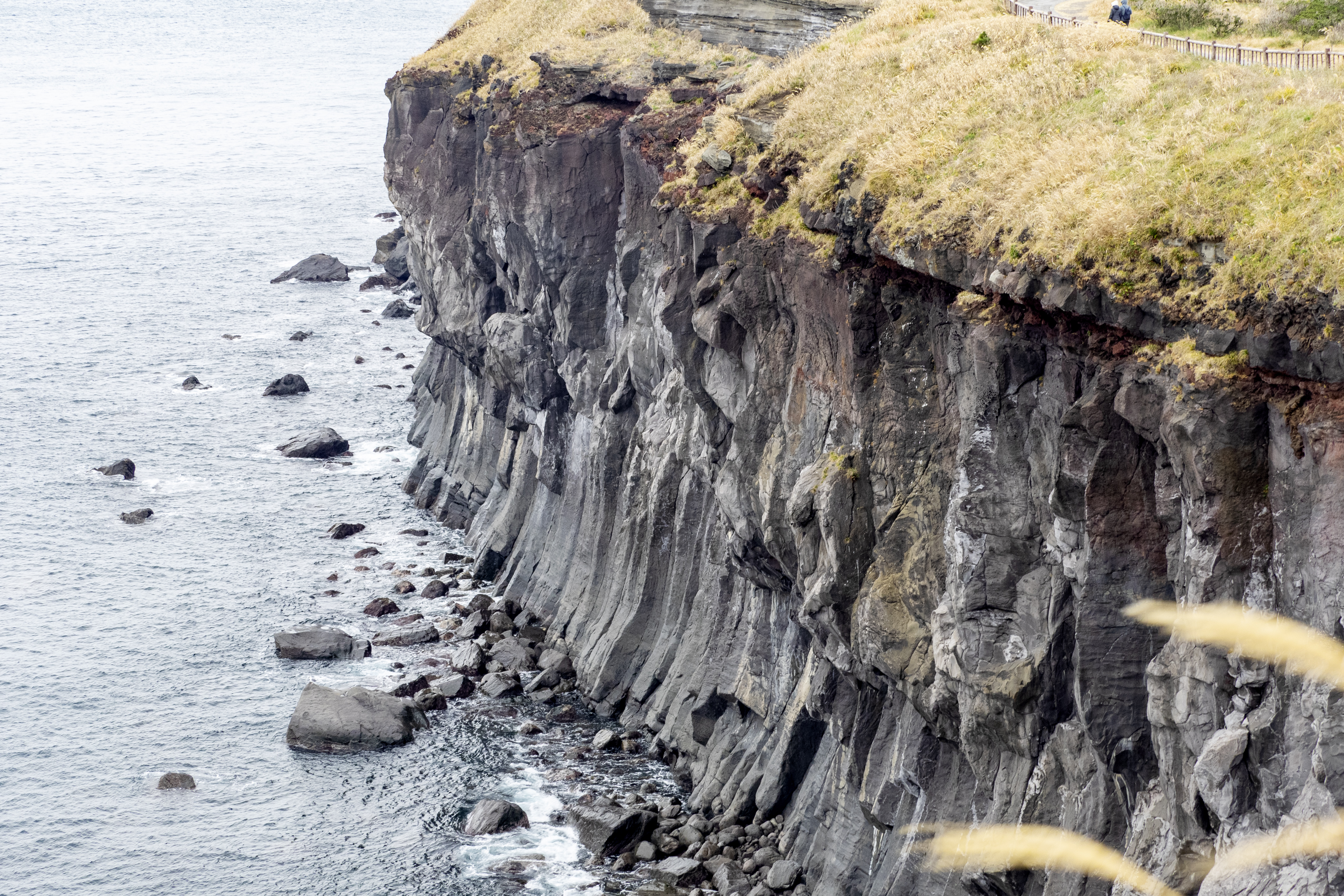 ▼ 오른쪽 절벽-대평리 박수기정, 눈구름에 가려진 백록담(중앙)