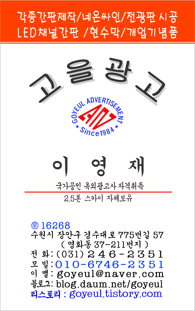 고을광고는 수원시 장안구 경수대로 775번길 57에 위치하고 있으며,