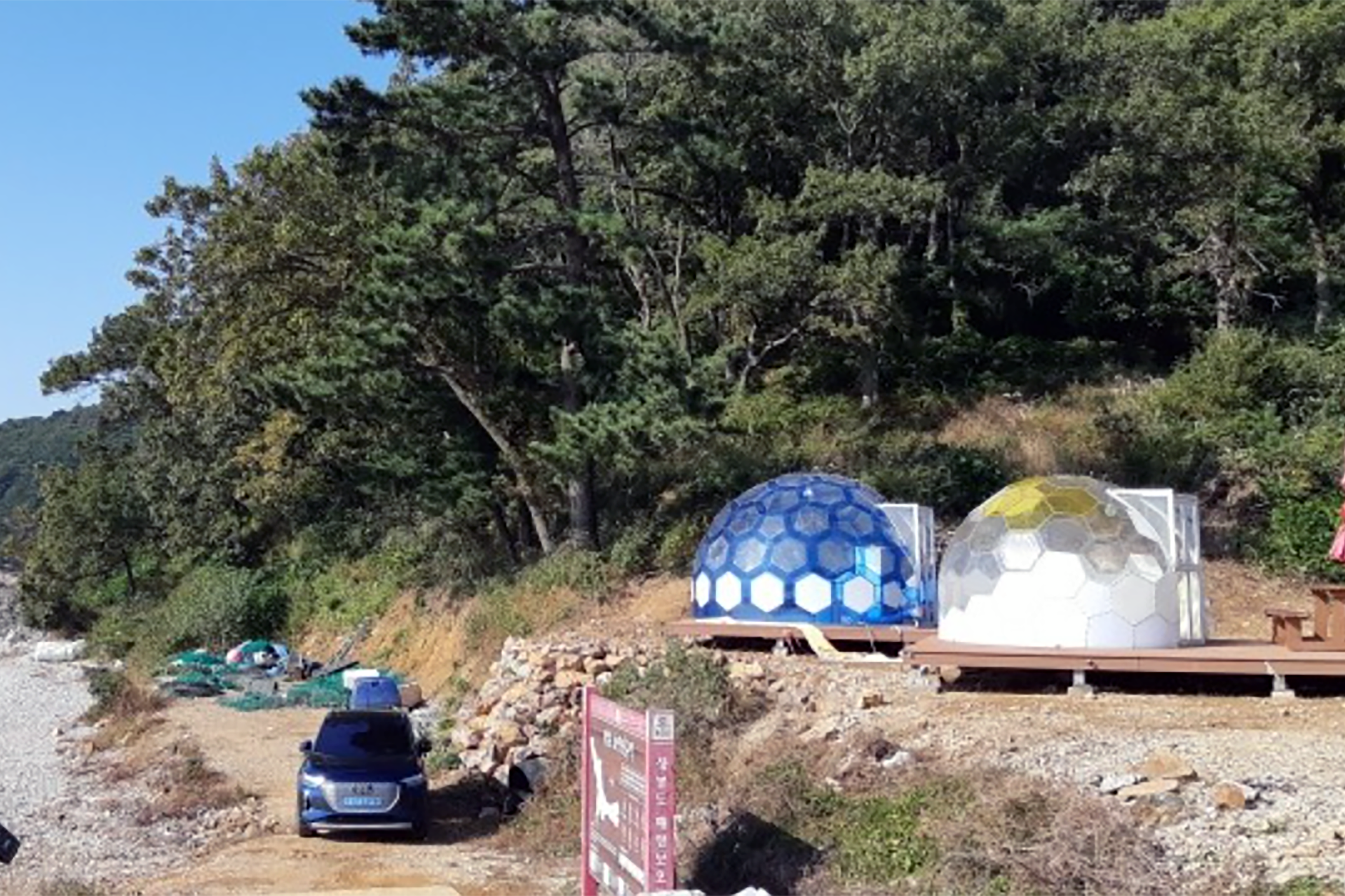 하얀색 돔하우스 바로 옆으로 등산로가 있습니다.