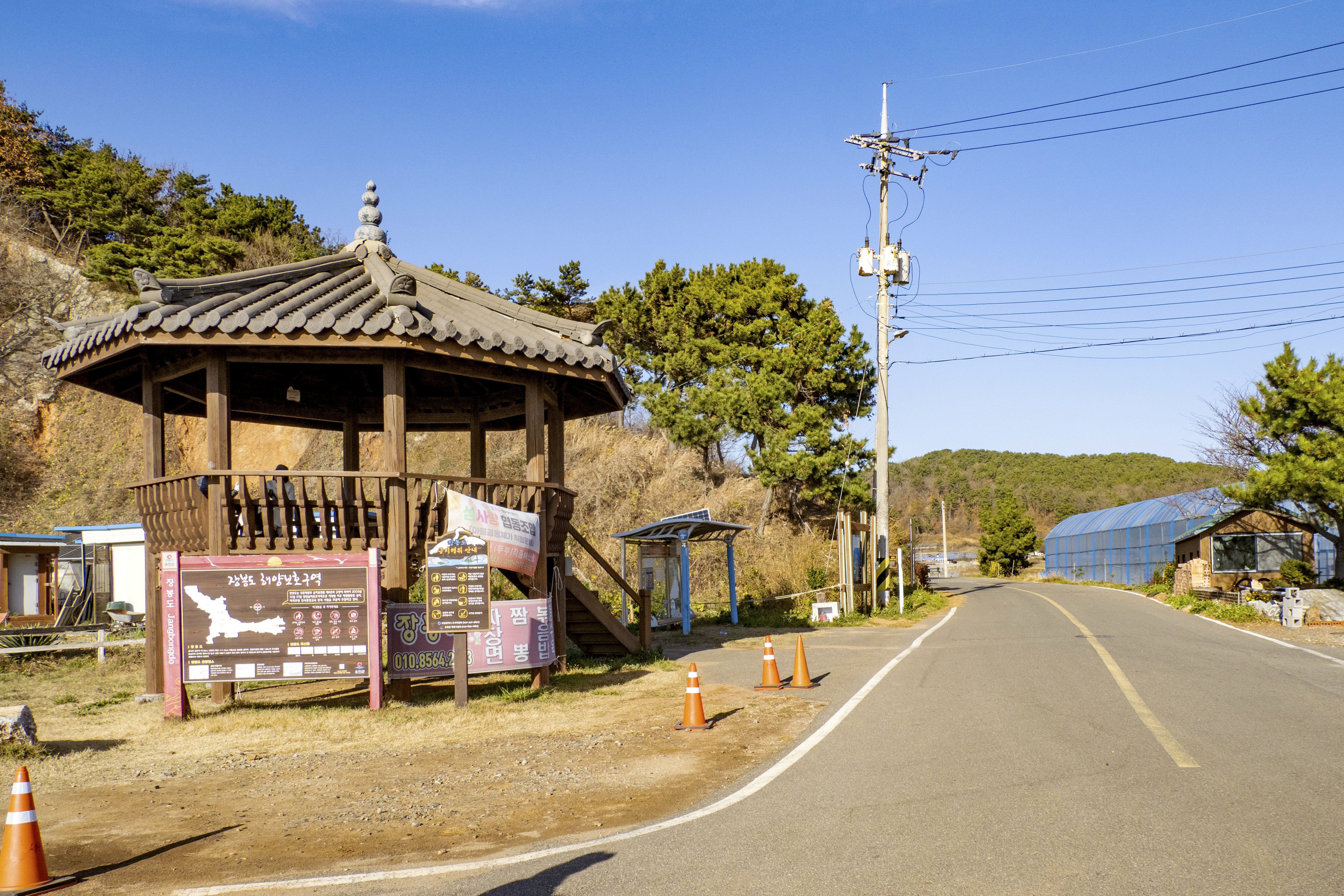 ▼ 휴앤뷰 팬션 앞 건어장해변과 가막머리전망대 가는 장봉4리 마을버스 정류장과 해안길 입구